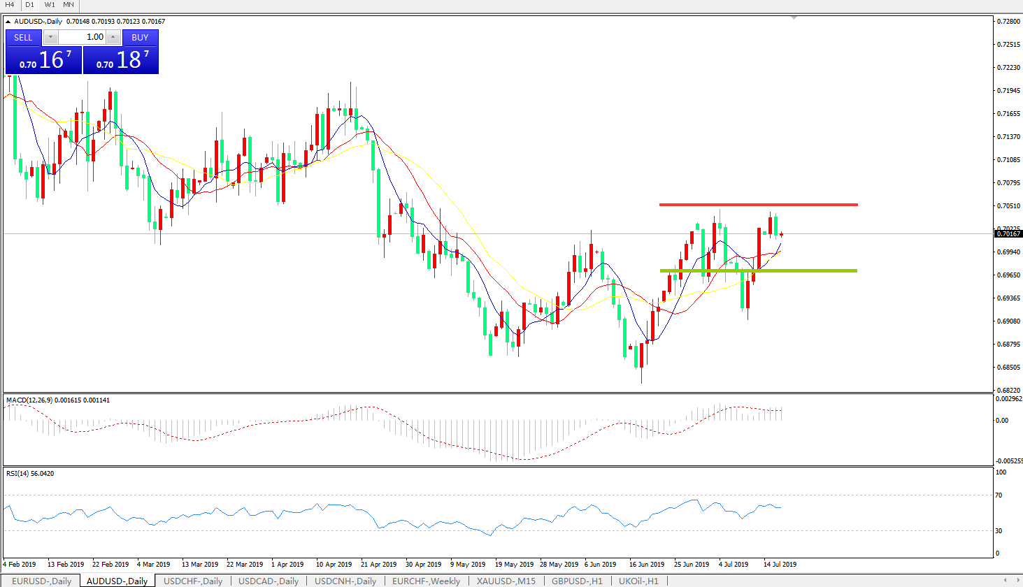 技术面简析:日图均线维持上攻态势,汇价昨日冲高乏力小幅下行,MACD在0轴上方运行且动能柱量能尚可,RSI小幅回落,前高0.7050附近压制强劲,汇价短期存向下调整空间。