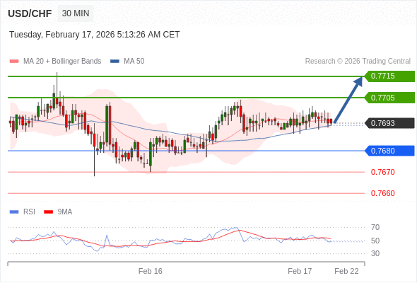在 0.7680 之上,看涨,目标价位为 0.7705 ,然后为 0.7715 。
