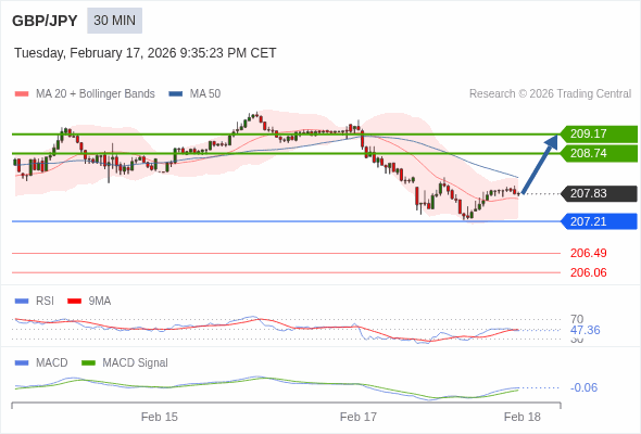 英镑/日元 当日内 : 有上涨的可能,目标价位定在 209.17 。
