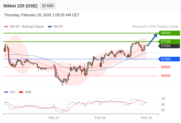 在 57090 之上,看涨,目标价位为 57700 ,然后为 58000 。