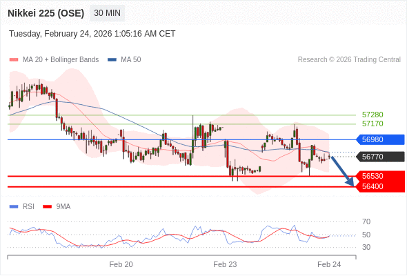 在 56980 之下,看跌,目标价位为 56530 ,然后为 56400 。