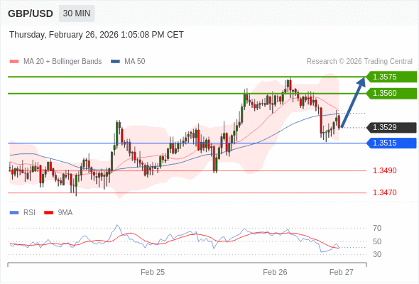 在 1.3515 之上,看涨,目标价位为 1.3560 ,然后为 1.3575 。