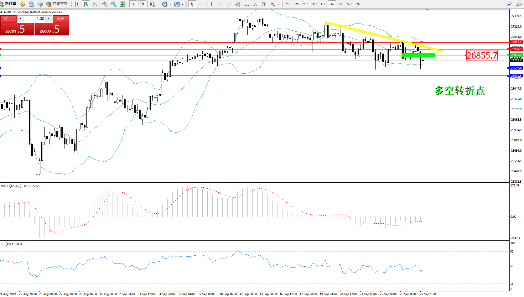 道琼斯指数DJ30—— 4小时K线图显示: