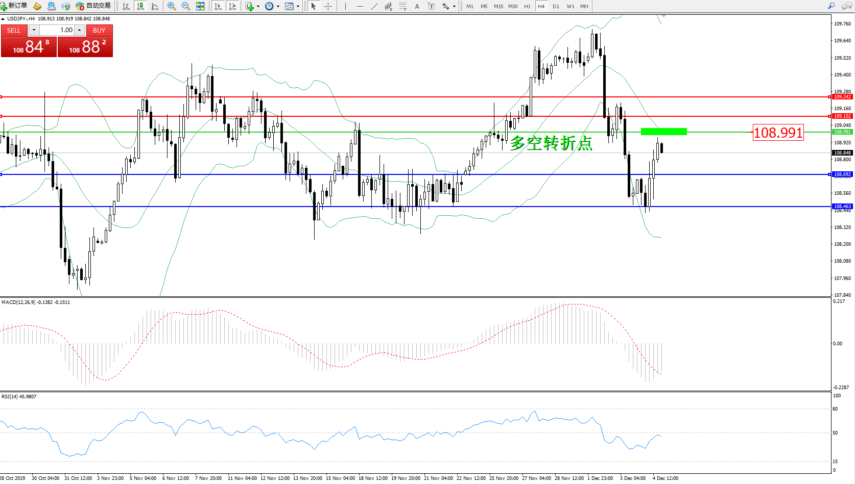 交易策略:108.991下方看跌,目标108.692、108.463