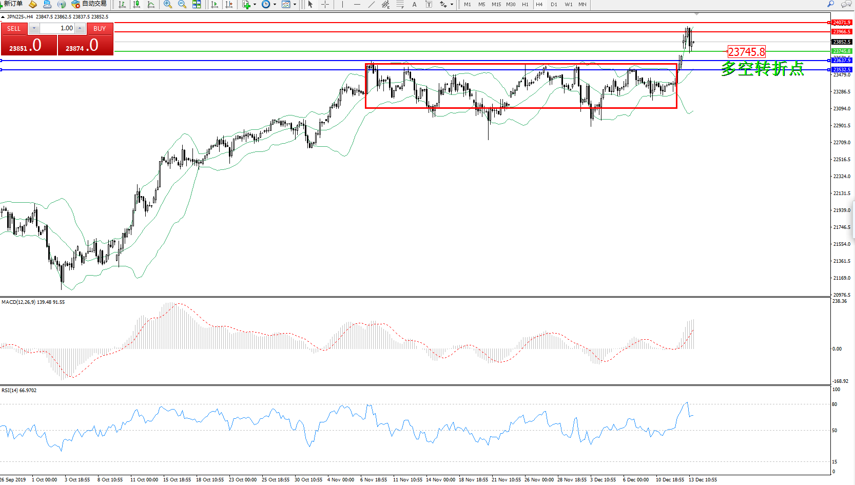 日经225指数12月13日(周五)收盘上涨609.19点,涨幅2.60%,报24034.00点。美国总统特朗普发表的关税方面言论,提振了市场乐观情绪,日本首相安倍晋三:将热烈欢迎英国加入TPP贸易协议,希望继续推进16个国家参与的区域全面经济伙伴关系协定(RCEP),内阁将会在今日通过额外预算案,本人的“政治遗产”将是恢复经济,我还有2年的任期,目前还没有结束,希望成为成功修宪的首相,目前来说,提高消费税的效果比上一次小。会密切关注提高消费税的效果。希望英国决定其方向,使前景更加清晰。