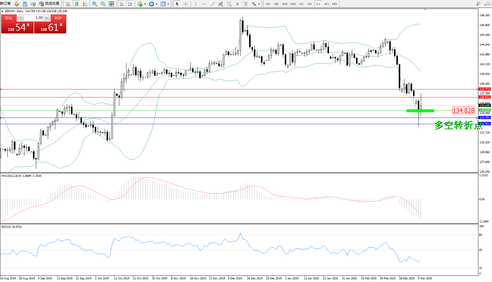 交易策略:134.828上方看涨,目标136.653137.772
