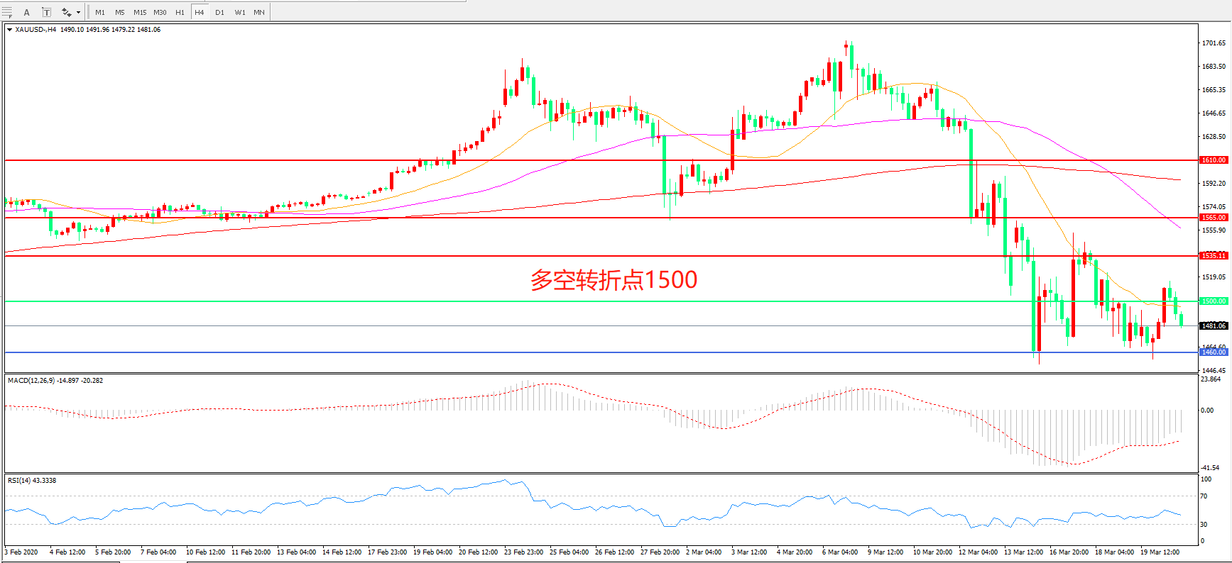 交易策略: 在 1500.00之下看跌,目标1460.00 1400.00