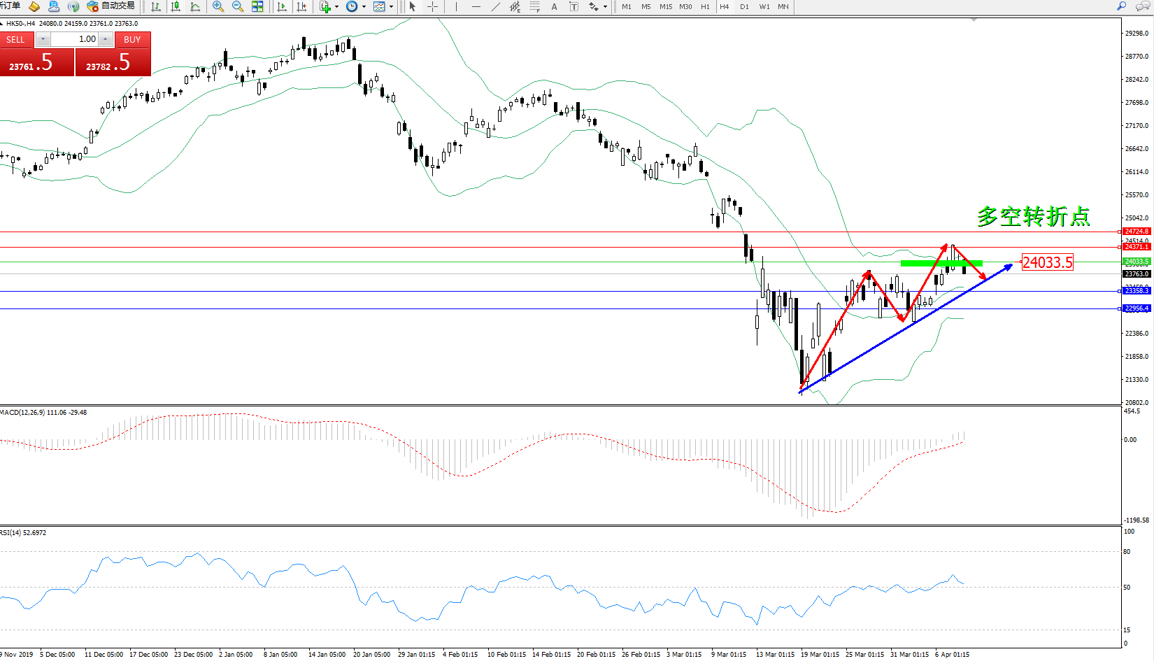 恒指HK50 ——4小时K线图显示: