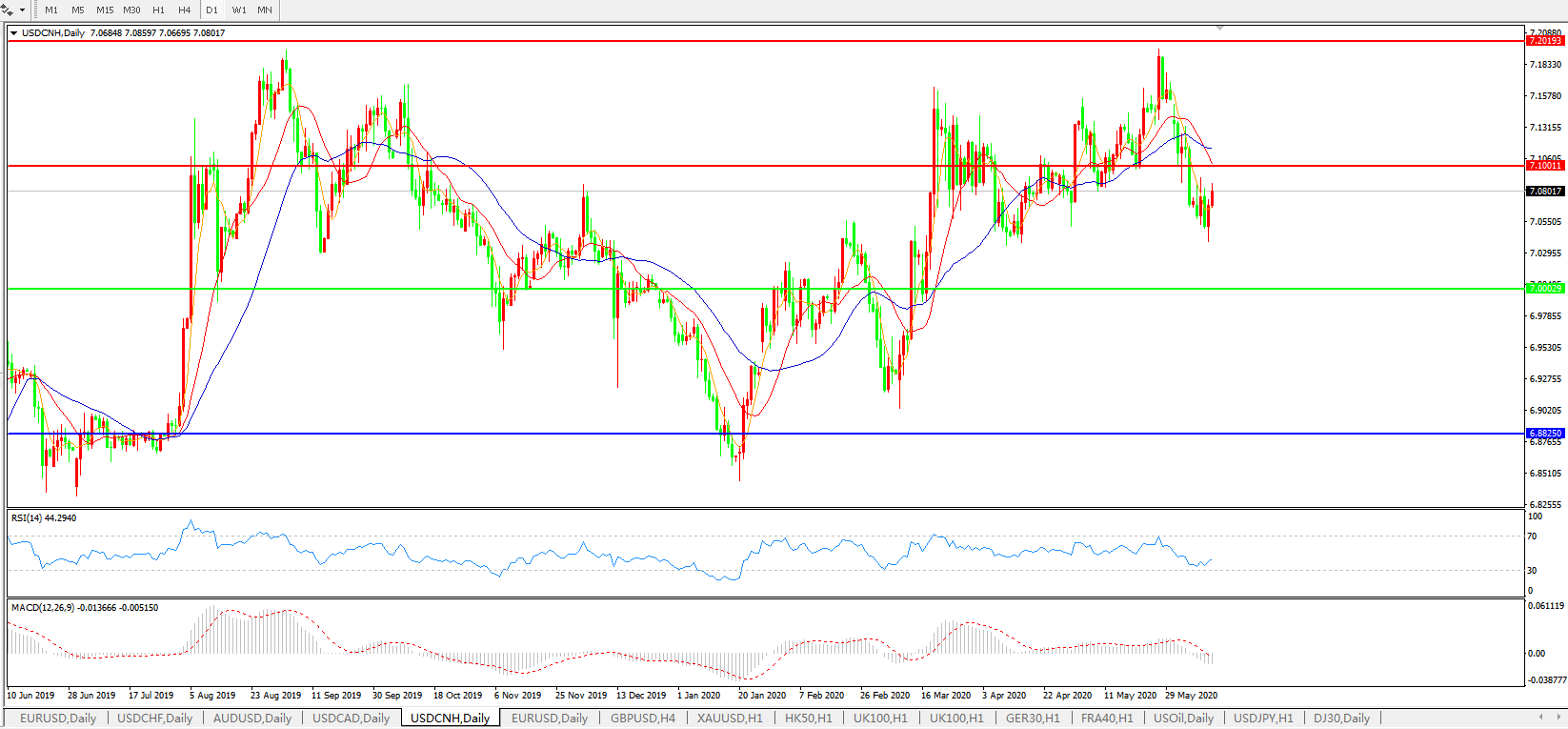 技术面简析:日图均线呈有序空头排列,汇价止跌回升但仍在7.10关口下方运行,MACD下穿0轴且量能0轴下放量,RSI小幅反弹,预计短期汇价或将进一步下行,关注7.00关口支撑。