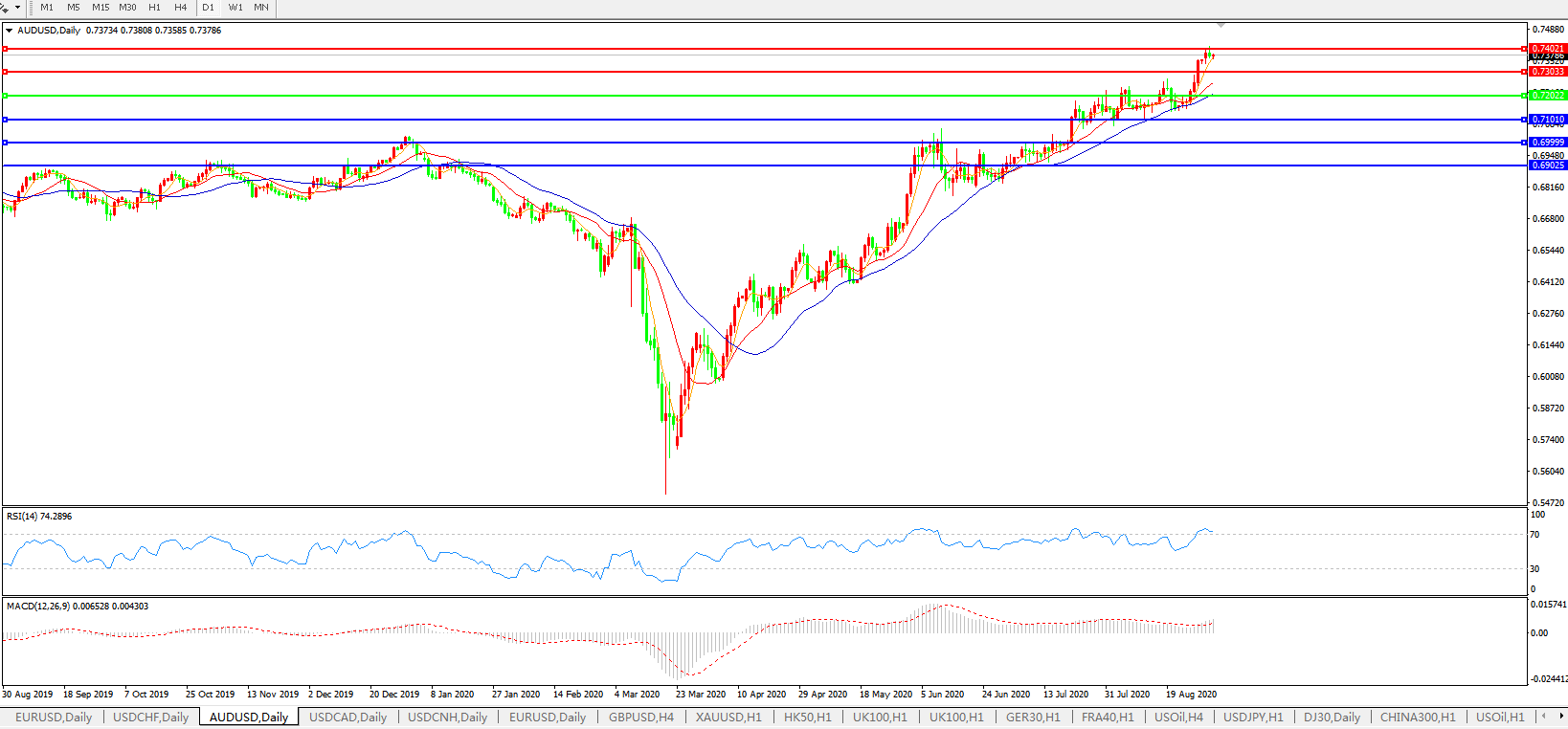交易策略:0.7200上方看涨,目标0.7300、0.7400
