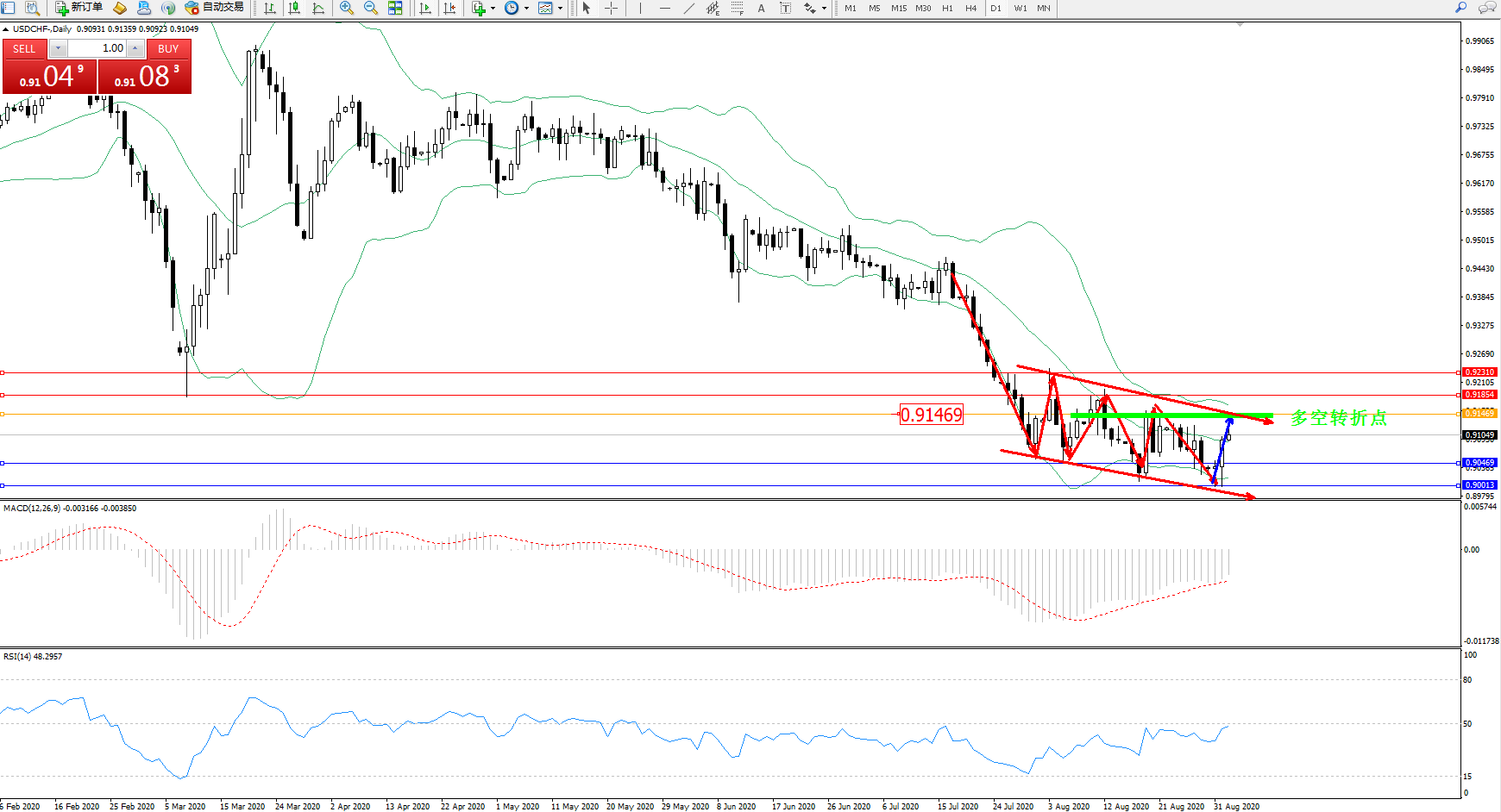 交易策略:0.91469下方看跌,目标0.90469、0.90013