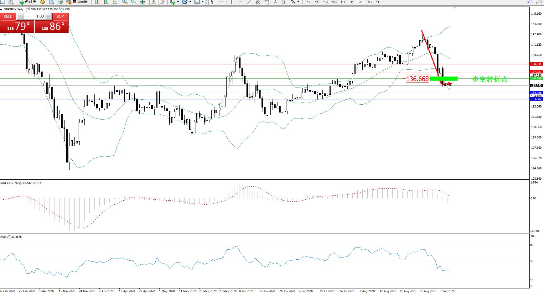 交易策略:136.668下方看跌,目标134.796、133.982