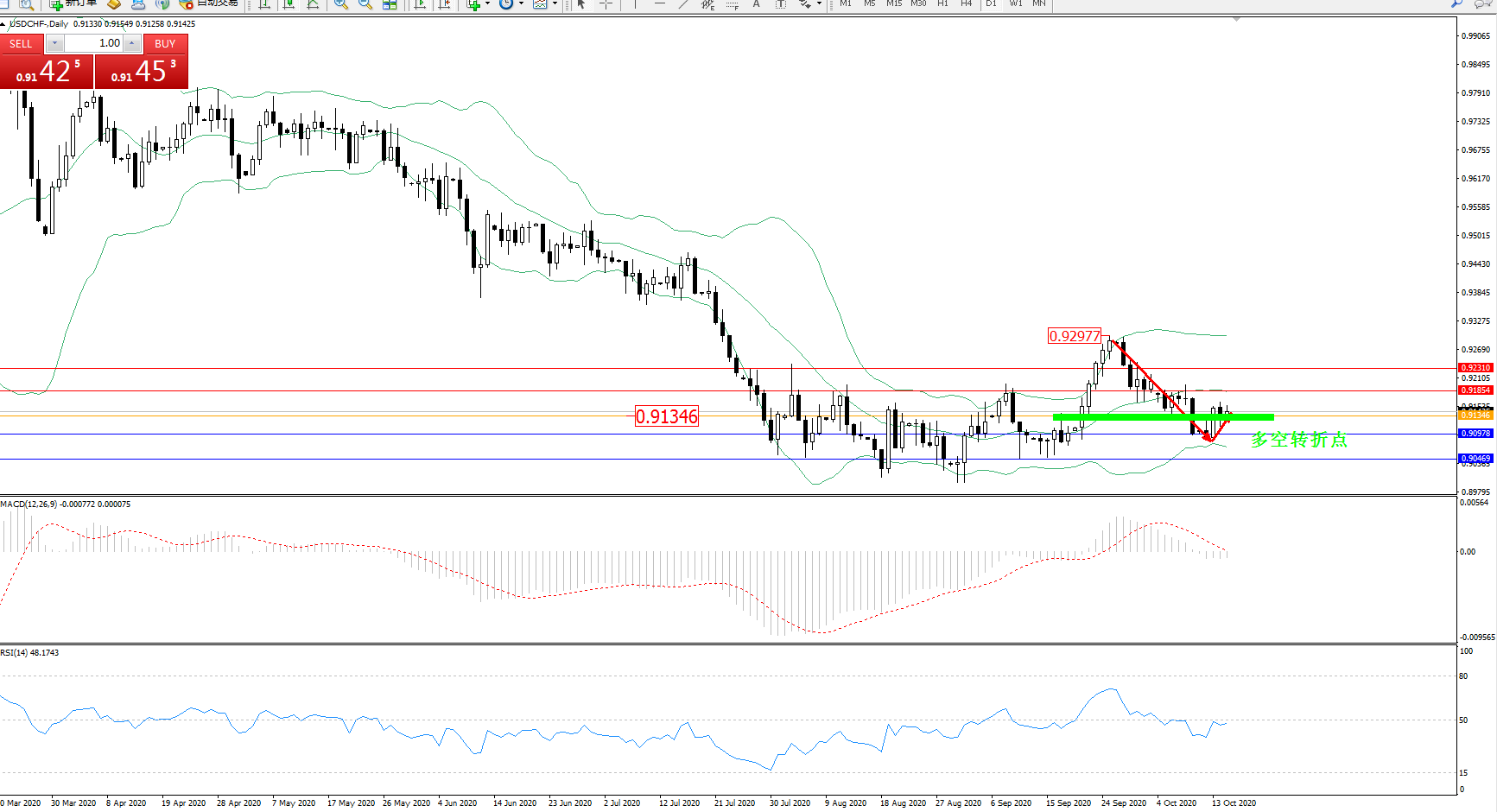 交易策略:0.91346上方看涨,目标0.91854、0.92310