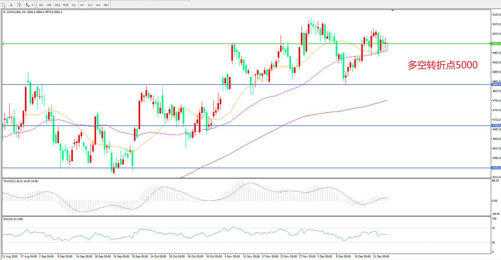 4小时图看,沪深300以21周期均线为依托震荡上行,短期走势陷入震荡,5000点成为多空分水岭,MACD红柱缩短,RSI指标向下,日内延续震荡概率较大。