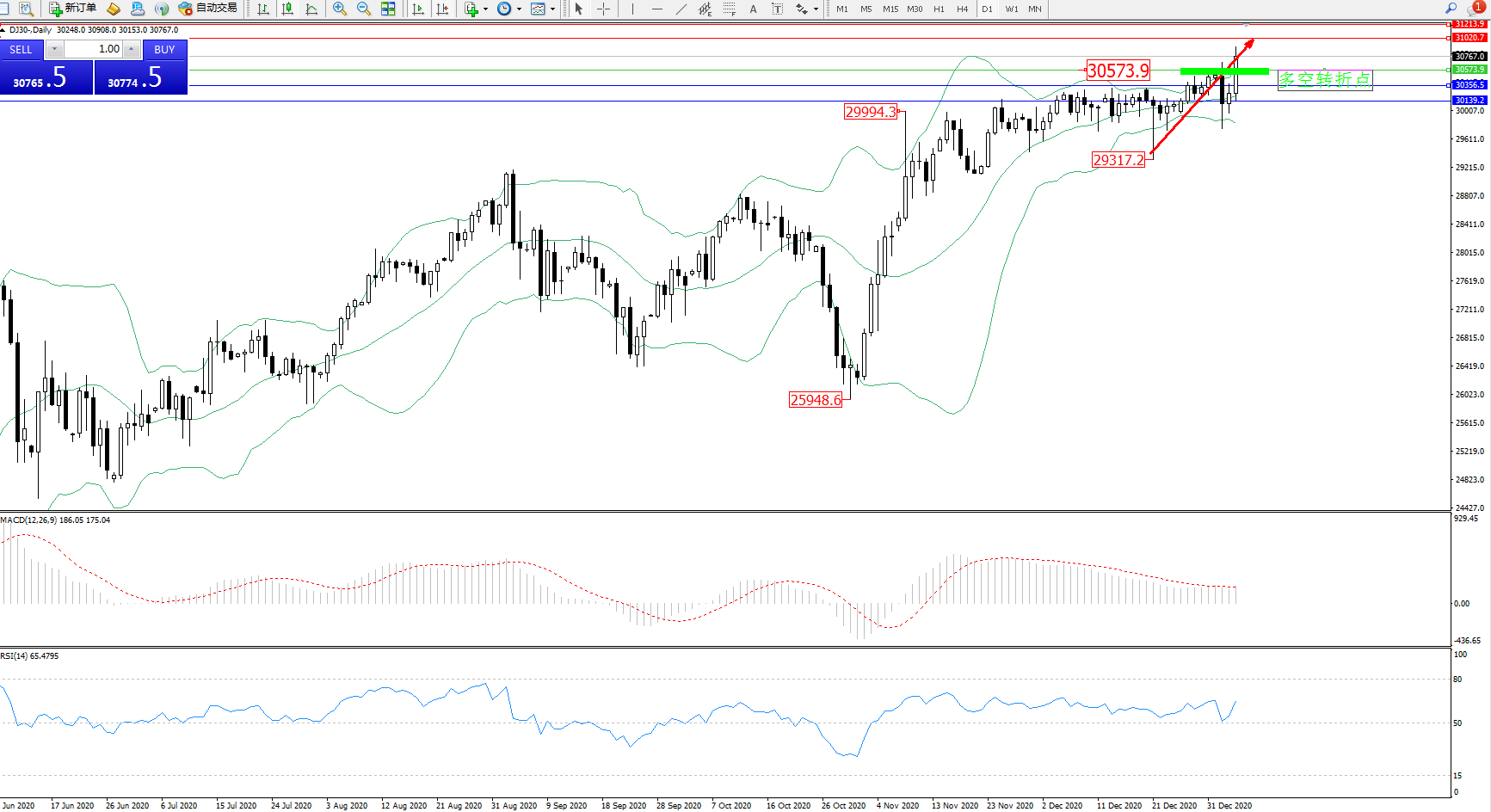道琼斯指数DJ30—— 日K线图显示: