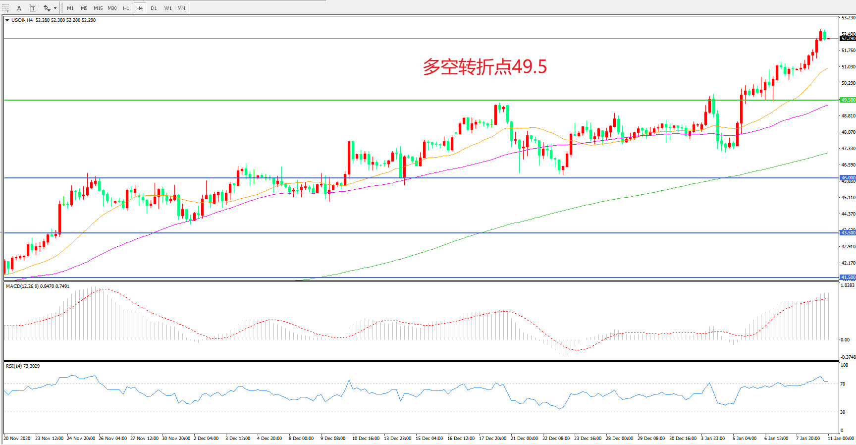 2021年开年首周,原油价格继续上行,周线大涨逾9%!美国WTI原油大幅上行,收报52.50美元/桶。在此前技术指标出现见顶迹象后,沙特的一则消息硬是把价格再次拉回到涨势之中,空头打压油价的愿望进一步落空,空仓等待的多头也失去了低价入场的机会。如果未来验证疫苗有效,那么原油价格就会在强势的基础上继续前行。