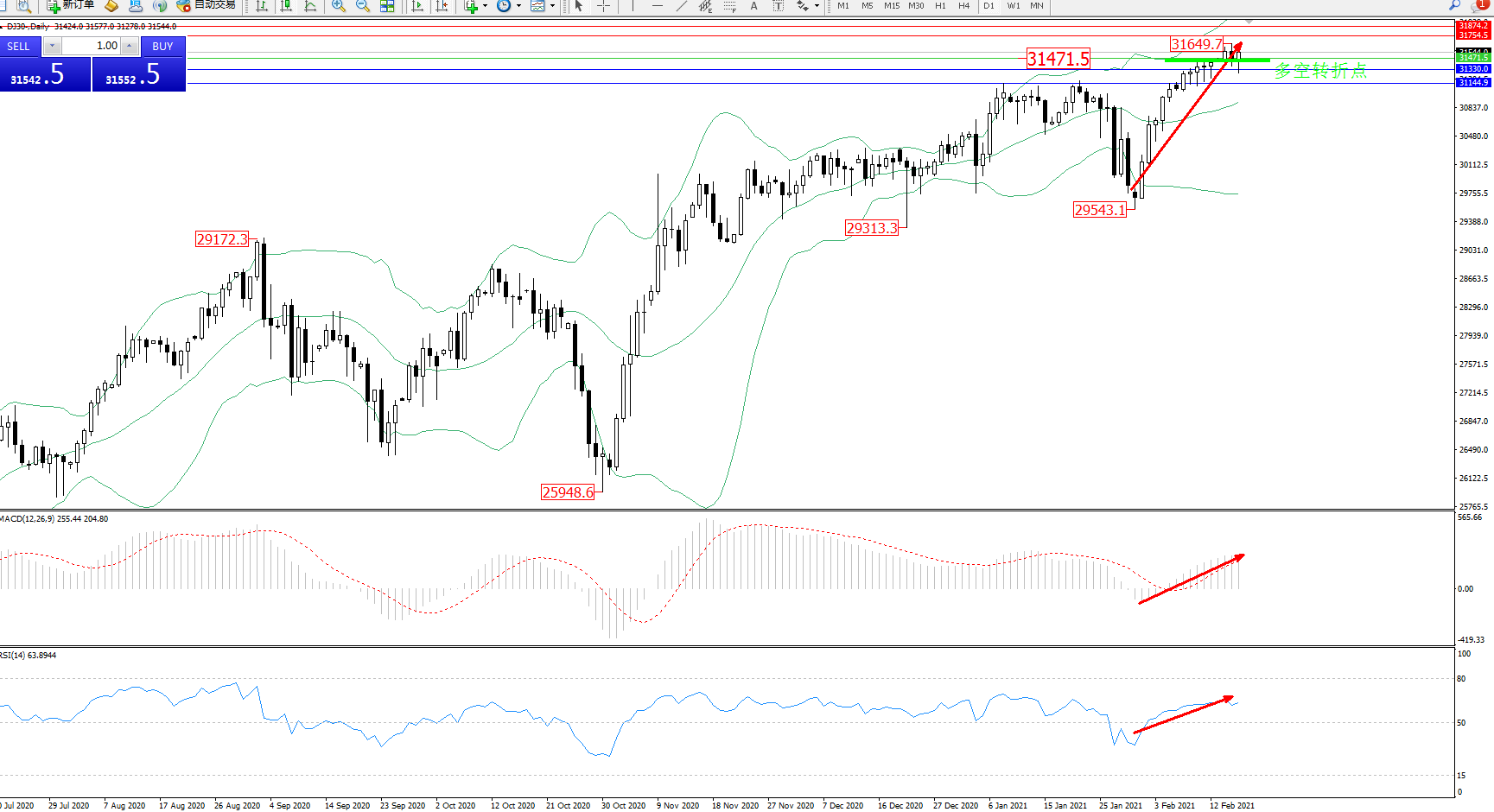 交易策略:31471上方看涨,目标31754、31874