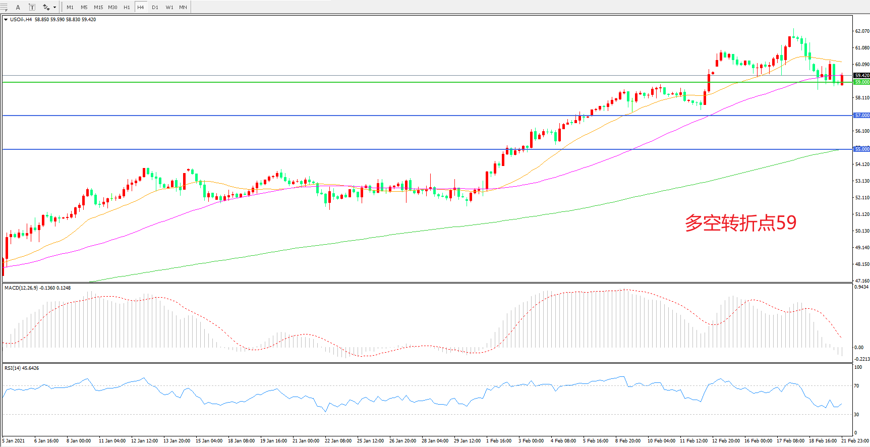 4小时图看,油价连续走高后出现短期调整,多头情绪有所回落,59美元成为多空分水岭,均线系统逐渐走平,MACD红柱缩短,RSI指标走平,日内延续震荡概率较大。