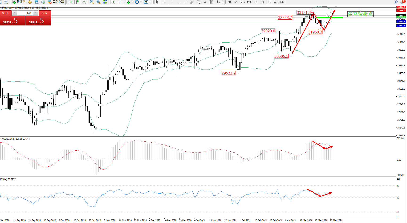 技术点评:多头动力延续布林带指标通道内持续震荡上扬,高位抵达33121位置后遇阻回撤,抵达31950位置得到支撑多头动力伺机入场反转上扬,多头不断向上拉升,布林带指标呈张口走势后开始收口向上移动,MACD指标处于多头区域高位整理平移,RSI指标处于多头区域高位弱势震荡回撤后开始反转上移;