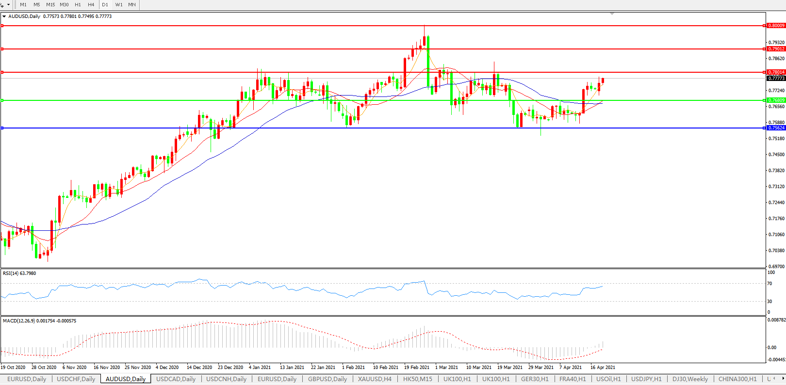 交易策略:0.7680上方看涨,目标0.7800、0.7900