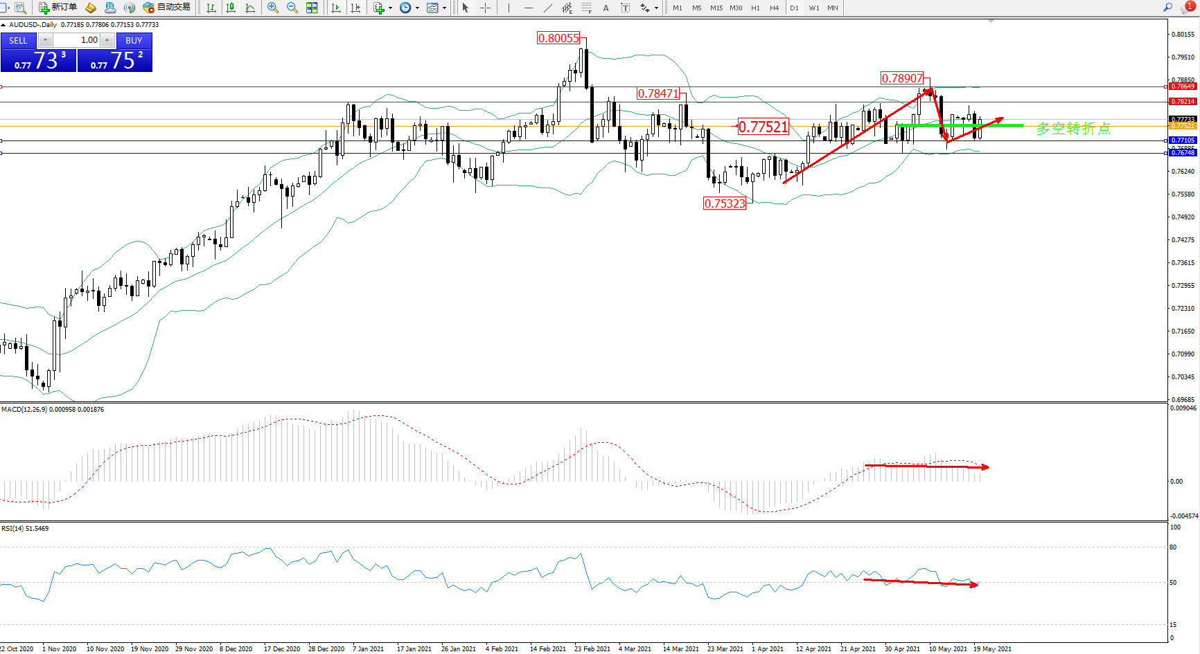 交易策略:0.77521上方看涨,目标0.78214、0.78649