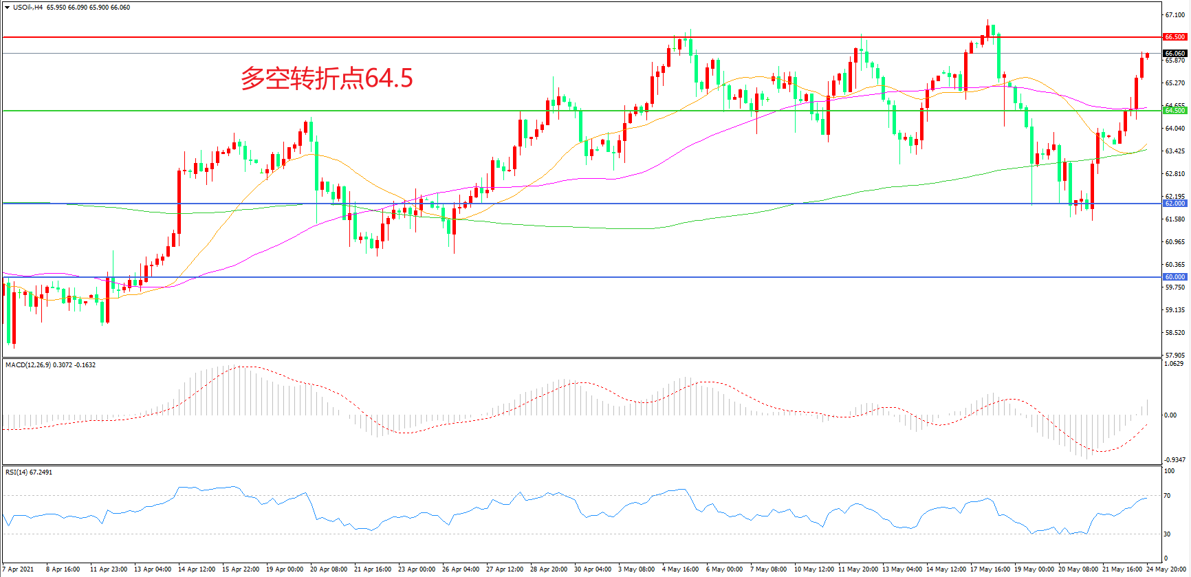 4小时图看,油价连续长阳拉升,短期走势有所回暖,55周期均线成为下方支撑,66.5美元成为中期阻力,MACD红柱增加,RSI指标向上,日内震荡上行概率较大。