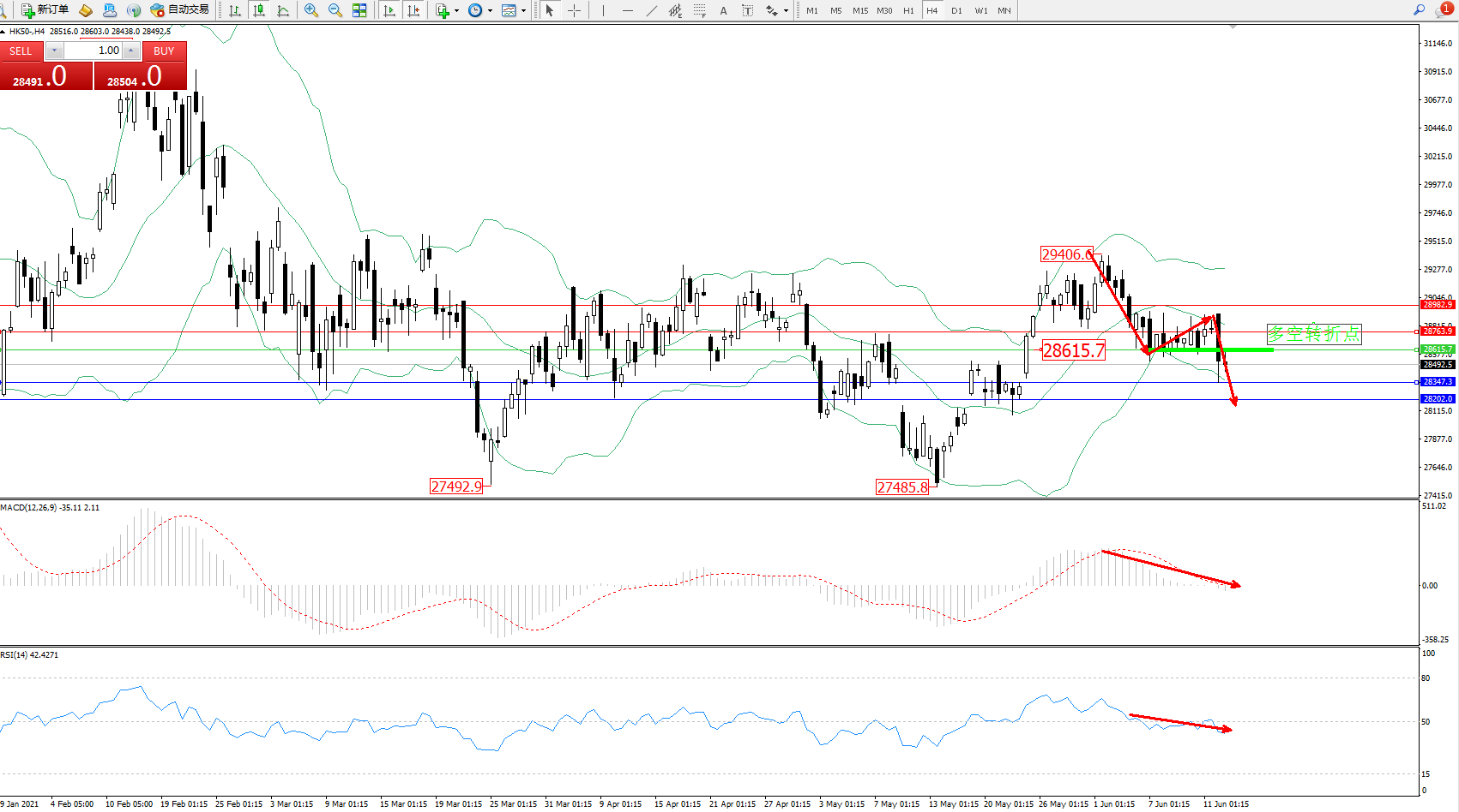 恒指HK50 ——4小时K线图显示: