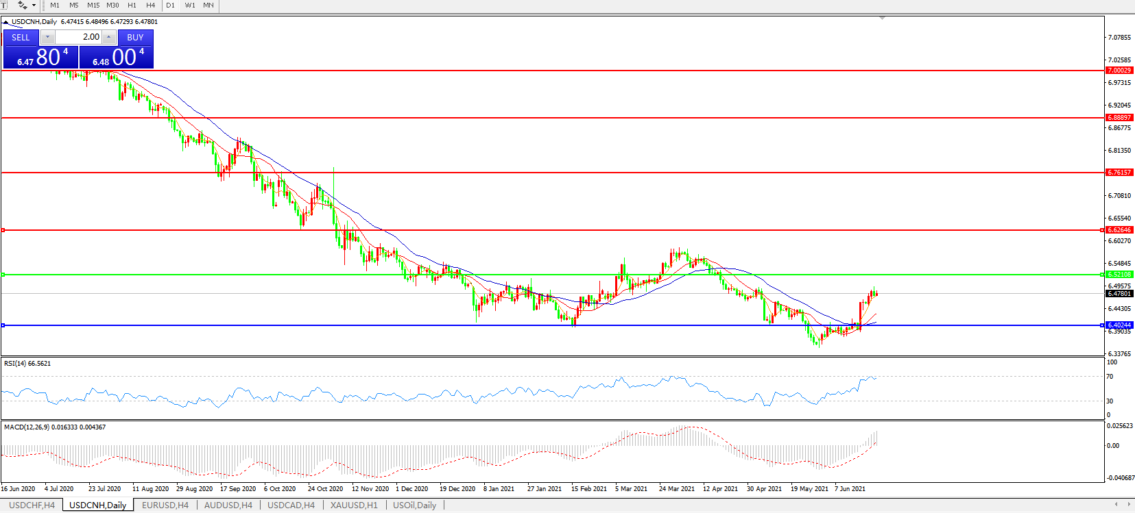 备选策略: 在6.5200之上,看涨,目标价位为6.6270,然后为6.7615。