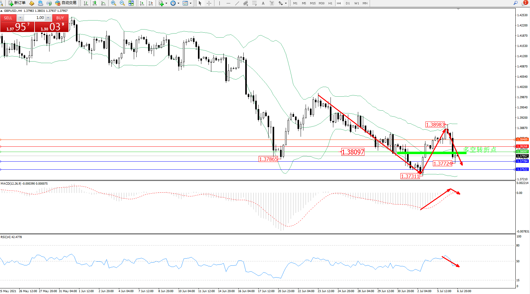 交易策略:1.38097下方看跌,目标1.37784、1.37522