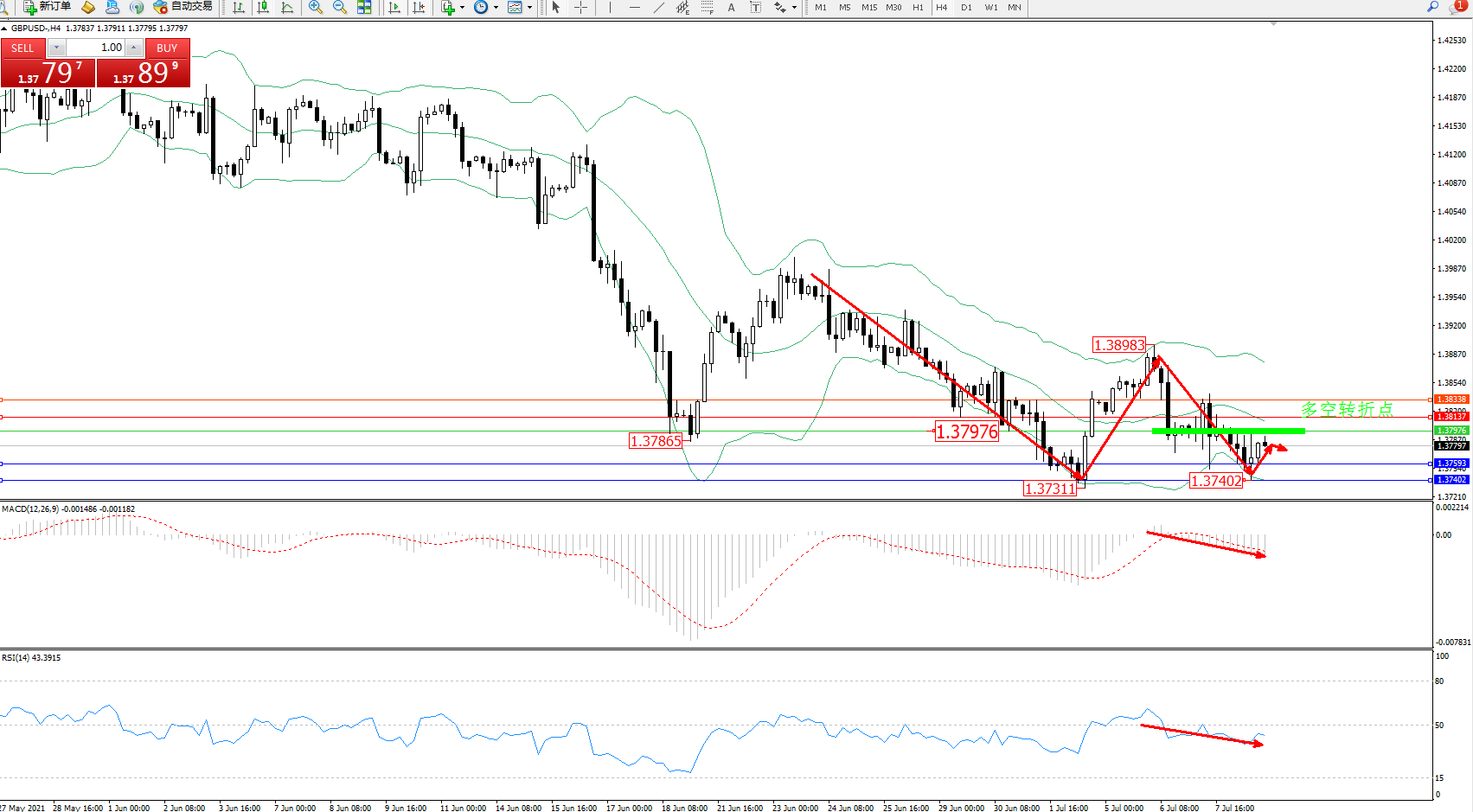 交易策略:1.37976下方看跌,目标1.37593、1.37402