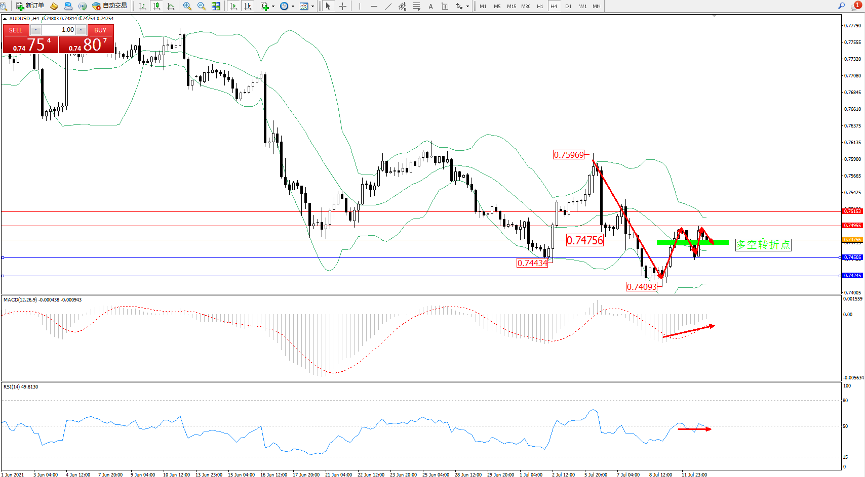 交易策略:0.74756上方看涨,目标0.74955、0.75153