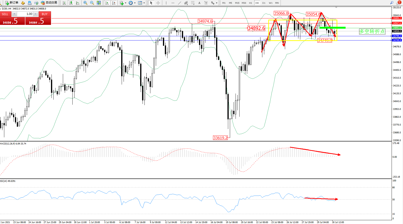 交易策略:34892下方看跌,目标34799、34749