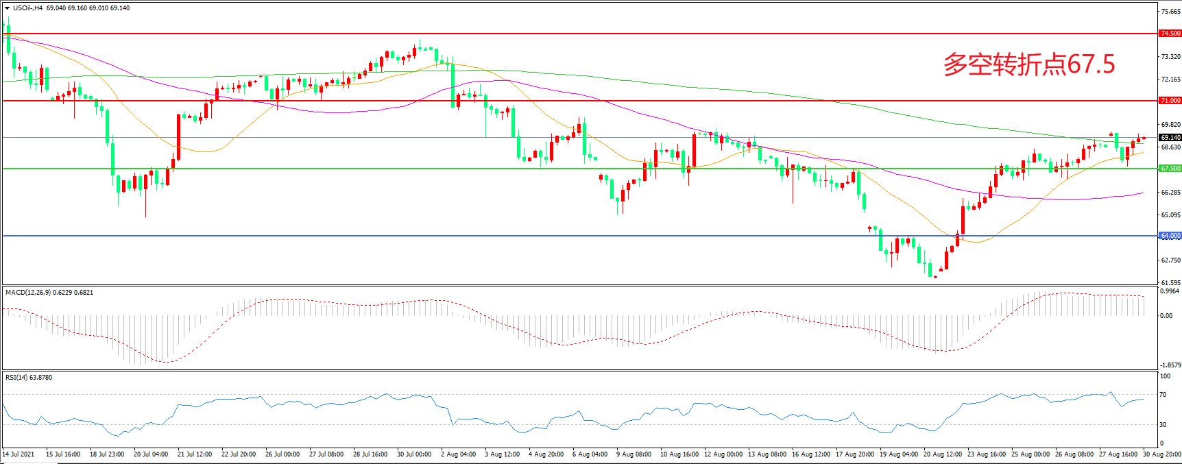 交易策略:在67.50之上看涨,目标71.00 74.50