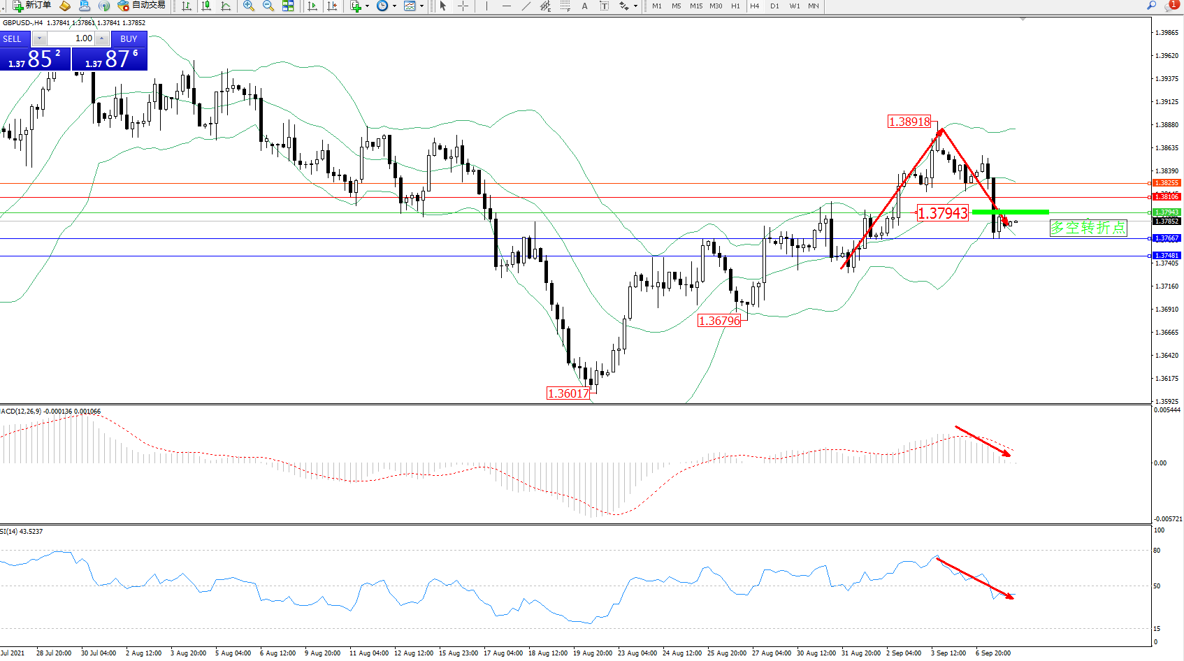 交易策略:1.37943下方看跌,目标1.37667、1.37481