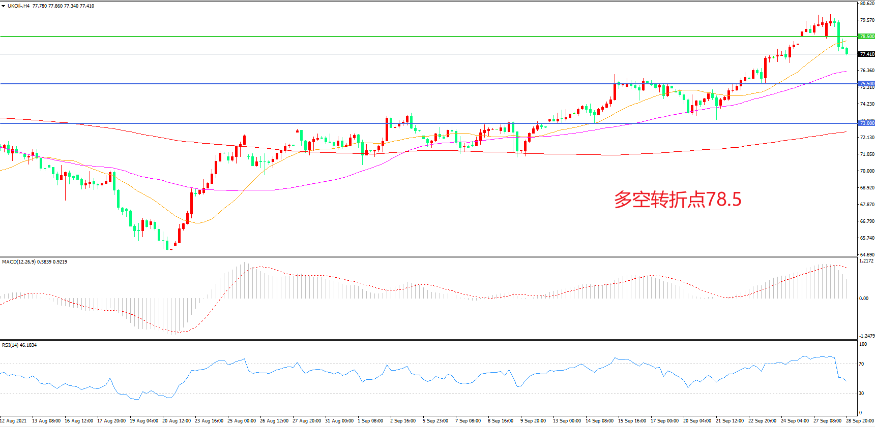 周二(9月28日), 因为有迹象表明需求超过供应并耗尽库存,全球能源偏紧的格局有加剧的趋势, 布伦特原油大幅冲高后出现获利回吐,最终收报77.41美元/桶。在全球性电力紧张的情况下,投资者对原油价格预期明显更加乐观,在回补跳空缺口后,油价有望再度拉升。