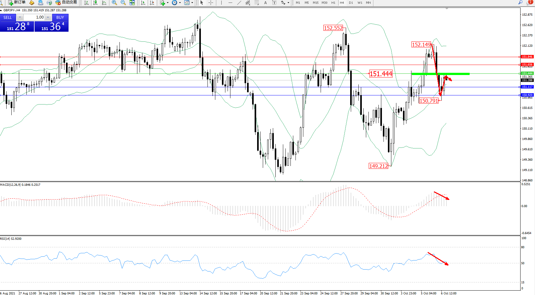 交易策略:151.444下方看跌,目标151.117、150.920