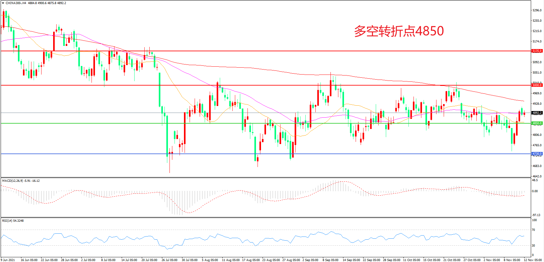 4小时图看,沪深300破位下行后震荡反弹,短期走势有所回暖,但200均线依然成为上方阻力,4850成为多空分水岭,MACD绿柱缩短,RSI指标走平,日内延续震荡概率较大。