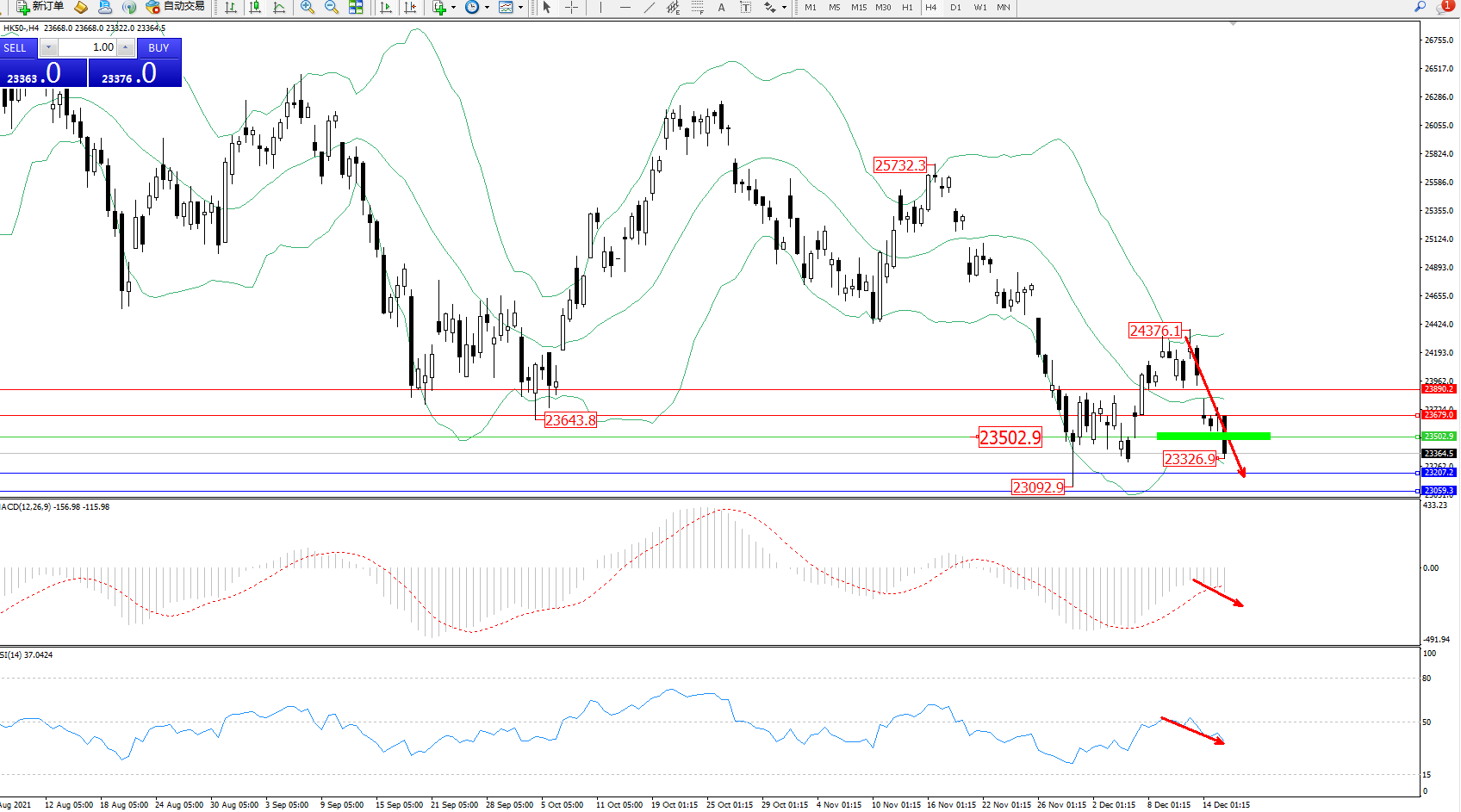 恒指HK50 ——4小时K线图显示: