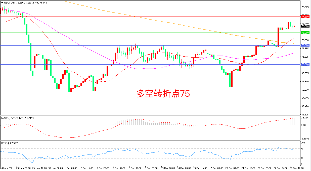 周二(12月28日),市场对奥密克戎打压全球用油需求的担忧正在消退,但伊朗核谈判重启让供需方面再起波澜,美国WTI原油延续强势表现,收报76.01美元/桶。投资者的目光都集中在1月4日以沙特和俄罗斯未收的OPEC+联盟是否决定2月继续增产40万桶/日,如果OPEC方面再度传出利好,油价有望维持强势。