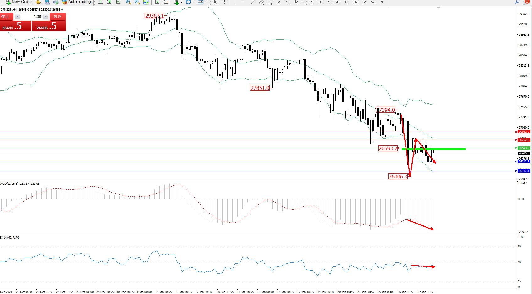 技术点评:空头动力延续布林带指标通道中下轨区间持续震荡下行,低位跌破布林带指标下轨附近节点至26006位置后得到支撑回升,但下行趋势态势良好,短期依旧有进一步向下移动态势,布林带指标呈张口走势持续中,MACD指标处于0轴线下方空头区域维持整理平移,RSI指标处于50均衡线下侧弱势徘徊中;