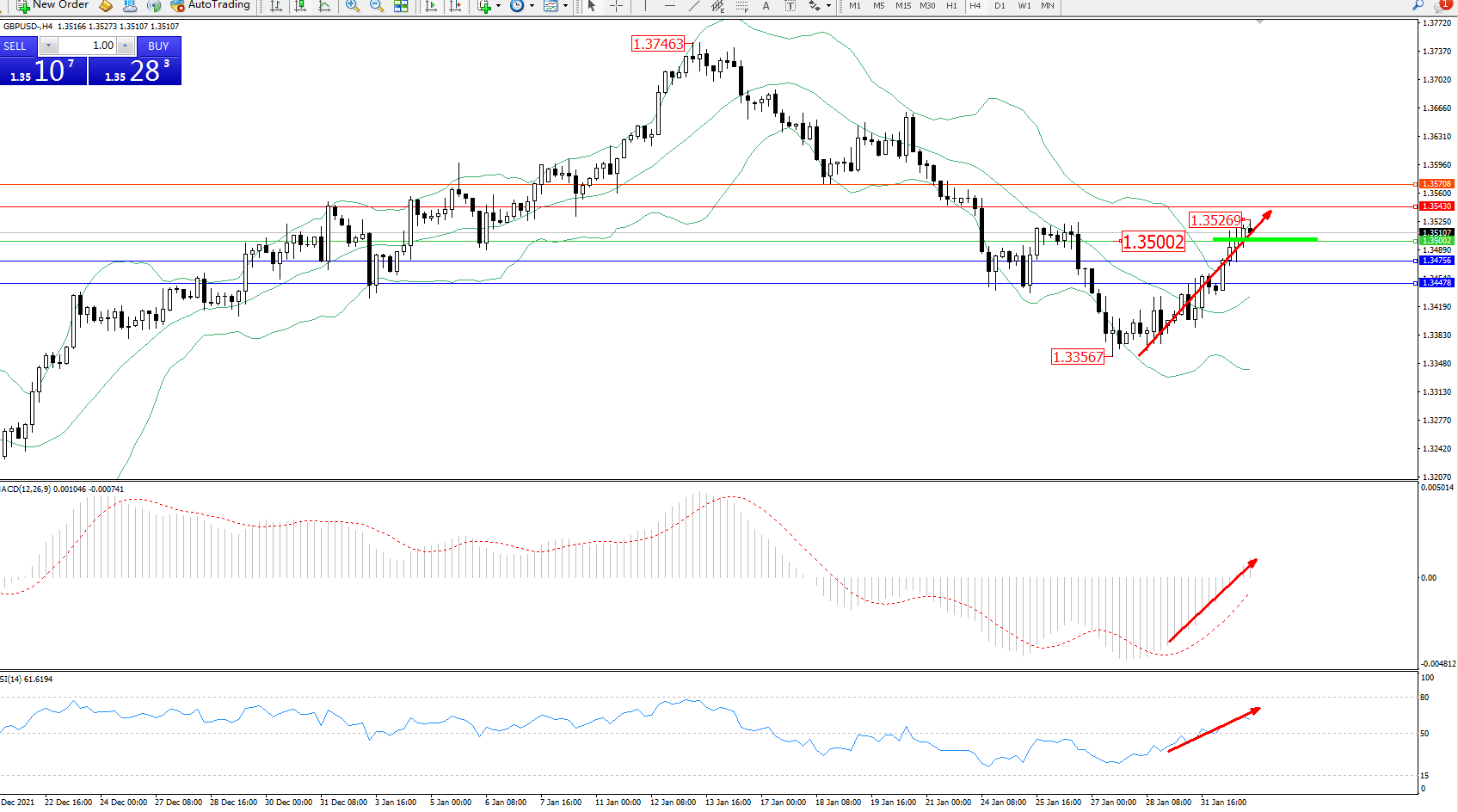 交易策略:1.35002上方看涨,目标1.35430、1.35708