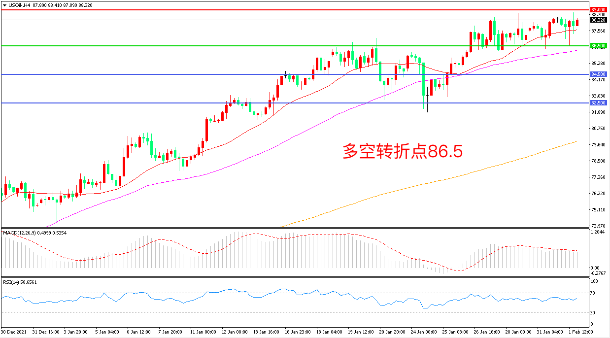 交易策略:在86.50之上看涨,目标89..00        92.00