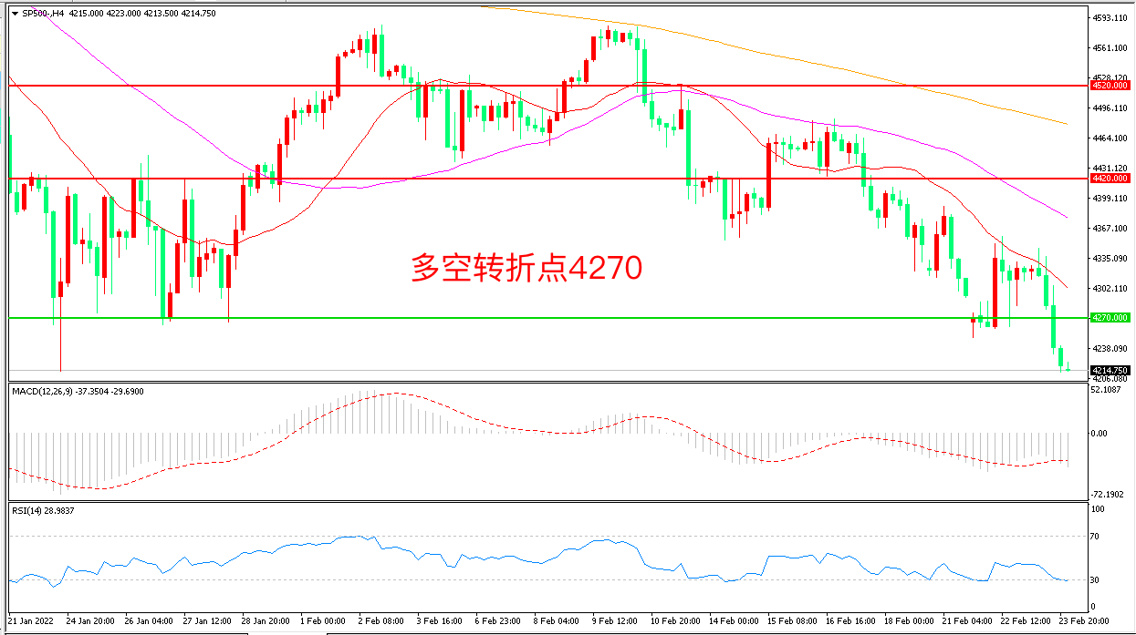 4小时图看,标普500长阴连续下挫,短期走势偏空,均线系统呈空头排列,MACD红柱增加,RSI指标走平,日内震荡下行概率较大。