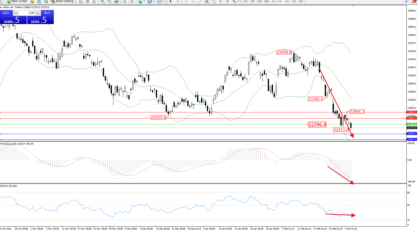 恒指HK50 ——4小时K线图显示: