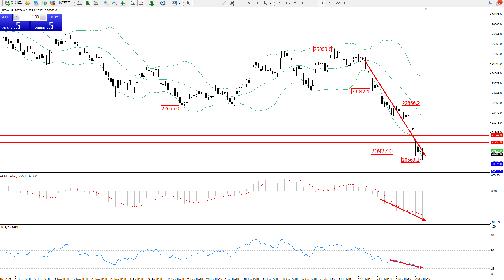 恒指HK50 ——4小时K线图显示: