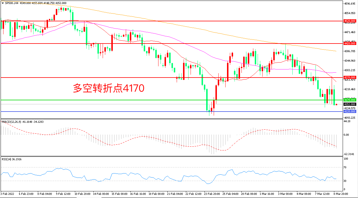 周二(3月8日),英国、美国禁止俄罗斯原油进口,西方对俄罗斯制裁扩大化加剧了市场情绪的恐慌,风险资产遭到抛售,标普500震荡下行,收报4162点。目前市场持续收到俄乌局势的影响,多头承压较重,日内市场将迎来美国CPI数据的冲击,务必重点关注。