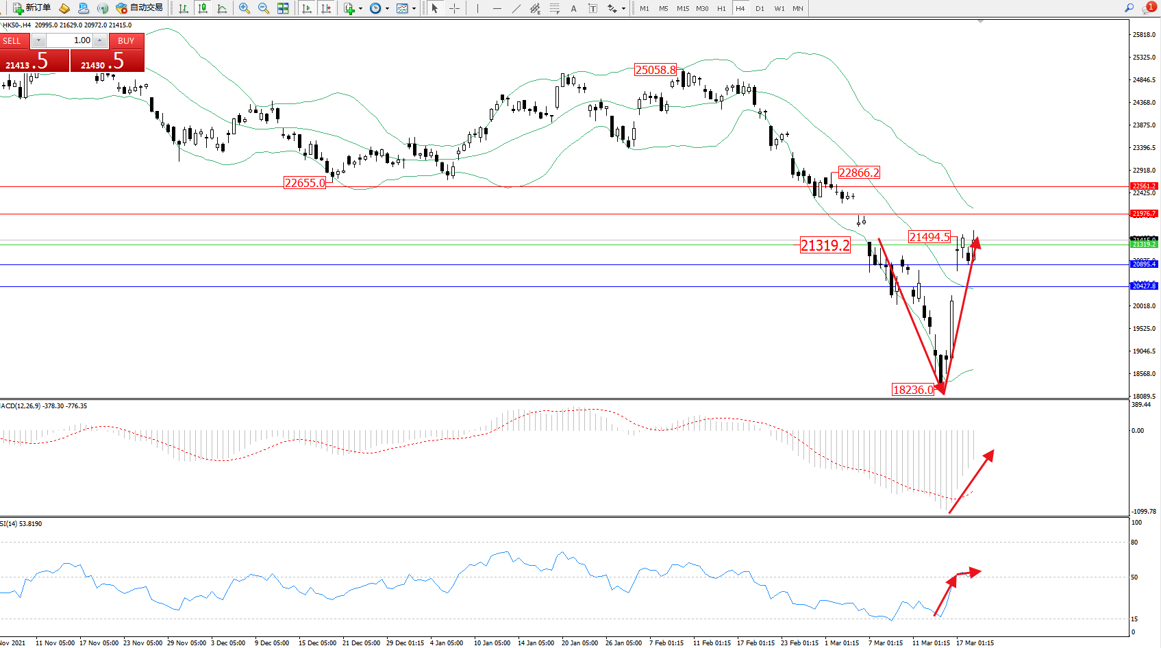 恒指HK50 ——4小时K线图显示: