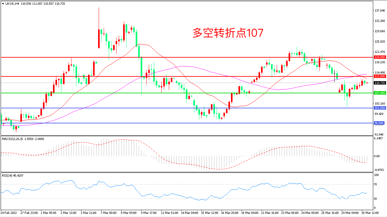 4小时图看,油价连续下挫后小幅拉升,短线有回暖迹象,107成为多空分水岭,MACD绿柱缩短,RSI指标走平,日内延续震荡概率较大。
