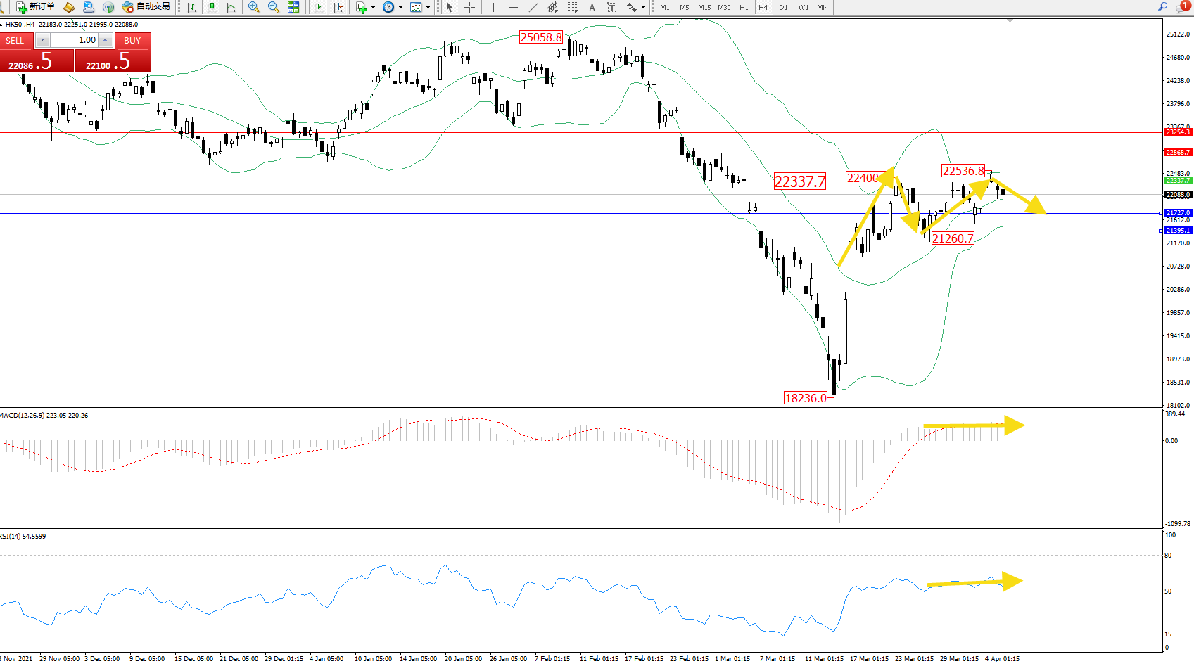 恒指HK50 ——4小时K线图显示: