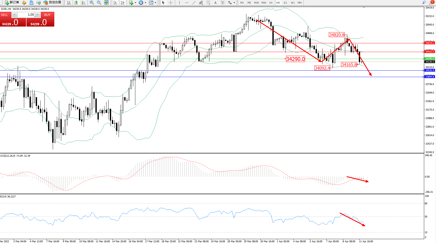 交易策略:34290下方看跌,目标34035、33894